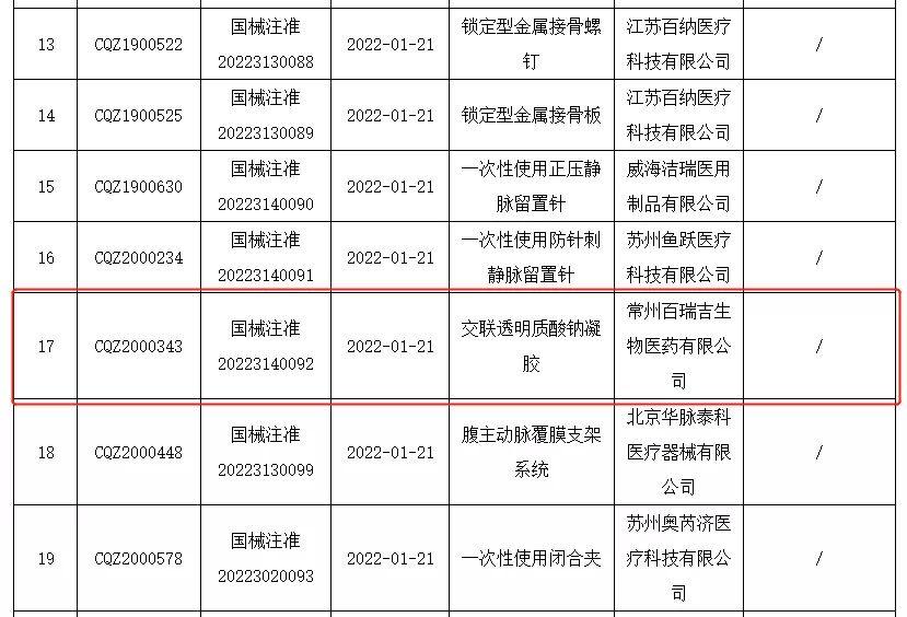 2022年1月26日,常州百瑞吉生物醫(yī)藥有限公司生產(chǎn)的產(chǎn)品“交聯(lián)透明質(zhì)酸鈉凝膠”獲NMPA批準(zhǔn)上市(國械注準(zhǔn)20223140092),產(chǎn)品用于預(yù)防盆腹腔術(shù)后粘連,恭喜百瑞吉產(chǎn)品獲得市場(chǎng)準(zhǔn)入。