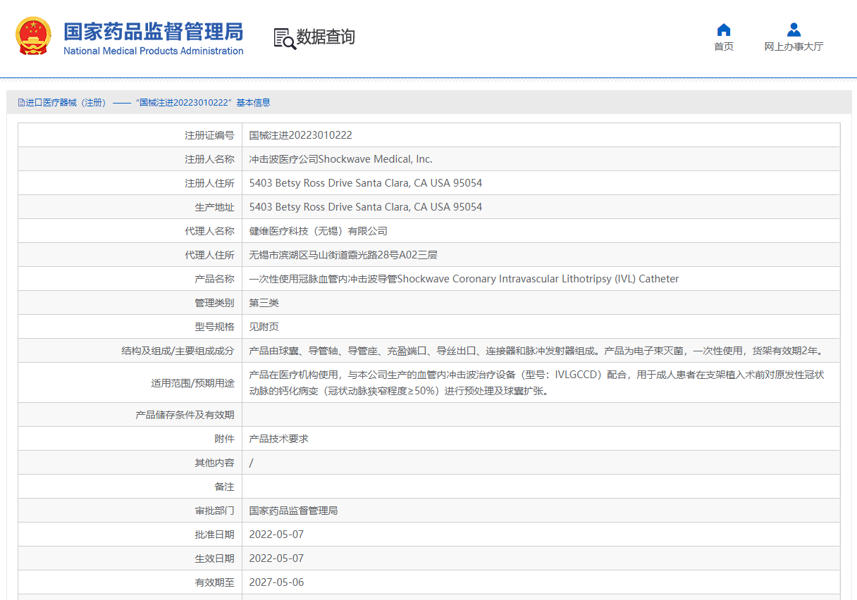 創(chuàng)新性技術(shù)正處于起步發(fā)展階段,美國ShockwaveMedical是全球第一家也是唯一一家推出沖擊波球囊的公司,目前尚無同類產(chǎn)品在我國獲準注冊,產(chǎn)品已在國外投入臨床使用,并于2022年5月24日經(jīng)NMPA批準上市。