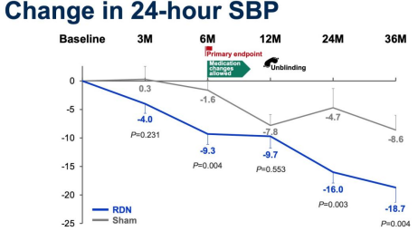 △ 試驗(yàn)結(jié)果:36個(gè)月的隨訪資料顯示,當(dāng)兩組使用了治療強(qiáng)度相似的抗高血壓藥物時(shí),RDN組動(dòng)態(tài)收縮壓降幅顯著高于假手術(shù)組,RDN治療與Sham相對(duì)比,顯著降低患者血壓可達(dá)3年,且無(wú)安全性問(wèn)題,這一療法可作為高血壓患者藥物治療的替代方案。