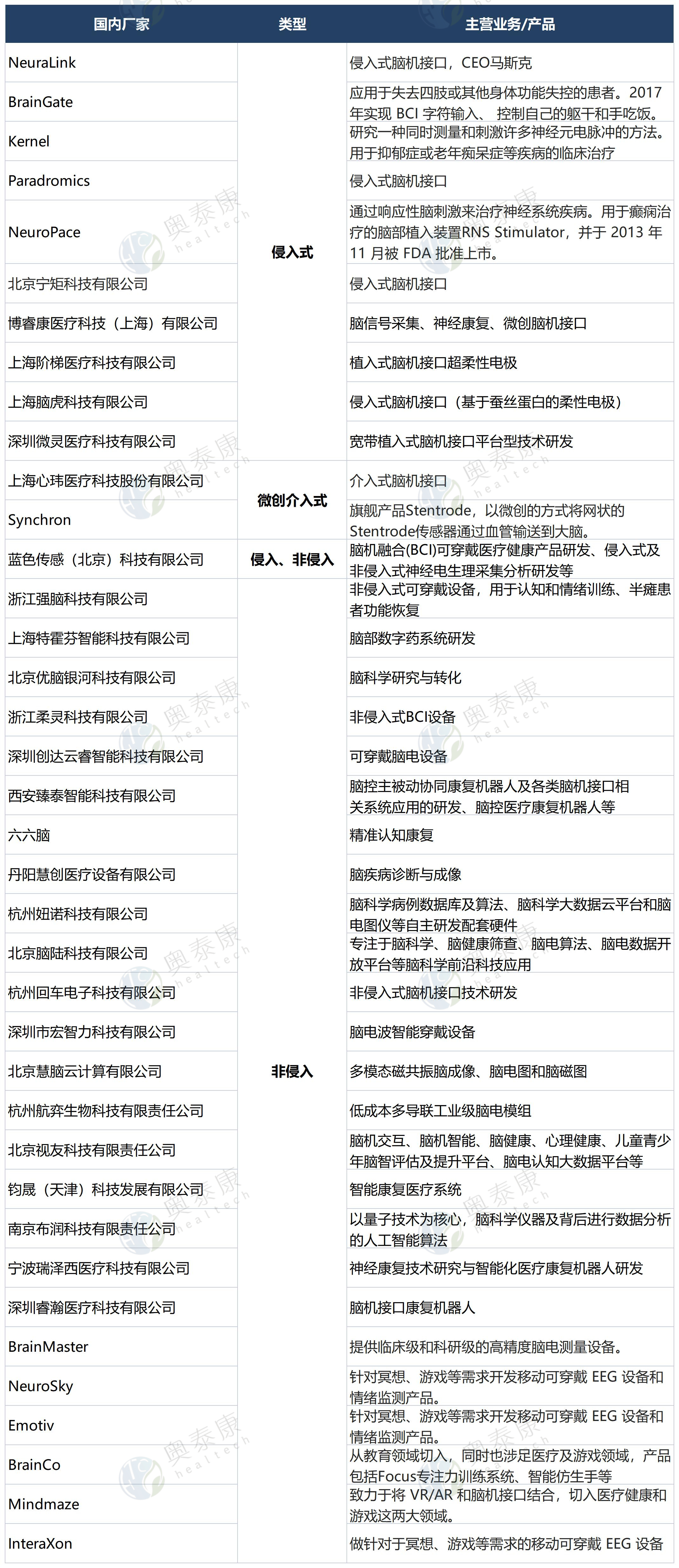 2015至2022上半年,國內(nèi)腦機(jī)接口行業(yè)共37家企業(yè)獲得融資。國外的研發(fā)廠家以Neuralink、Synchron、BrainGate、Blackrock Neurotech、ClearPoint Neuro、NeuroPace等為主,國內(nèi)布局的企業(yè)也日趨增多,以博睿康、腦虎科技、強(qiáng)腦科技、寧矩科技等為代表。由于腦機(jī)接口技術(shù)的發(fā)展路徑不相同,中國以非侵入式腦機(jī)接口企業(yè)為主,美國以侵入式腦機(jī)接口企業(yè)為主。