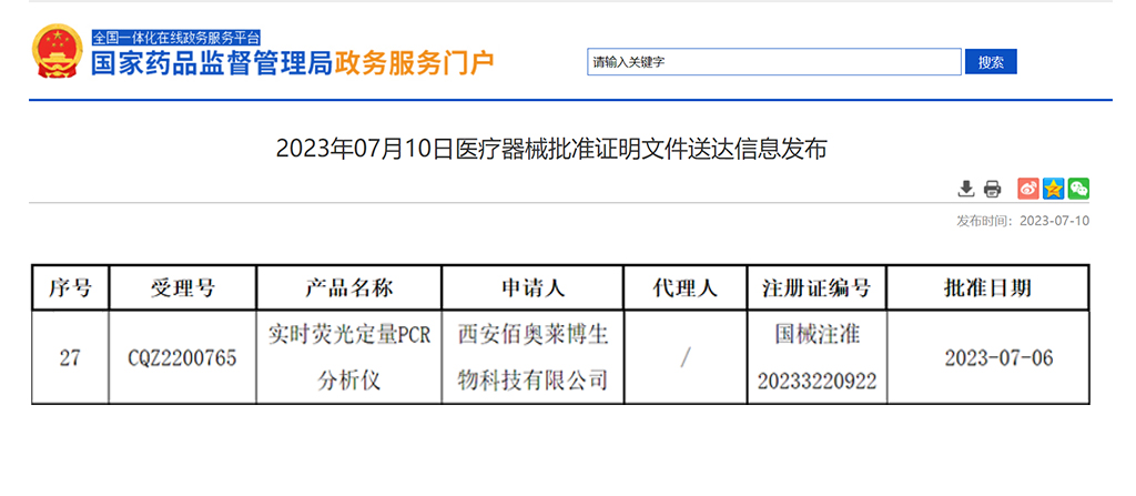 2023年7月6日,經(jīng)國家藥品監(jiān)督管理局公示,西安佰奧萊博生物科技有限公司的“實(shí)時(shí)熒光定量PCR分析儀”(國械注準(zhǔn)20233220922)獲得NMPA批準(zhǔn)上市,系2023年奧泰康助力獲得的第11張三類醫(yī)療器械注冊證。