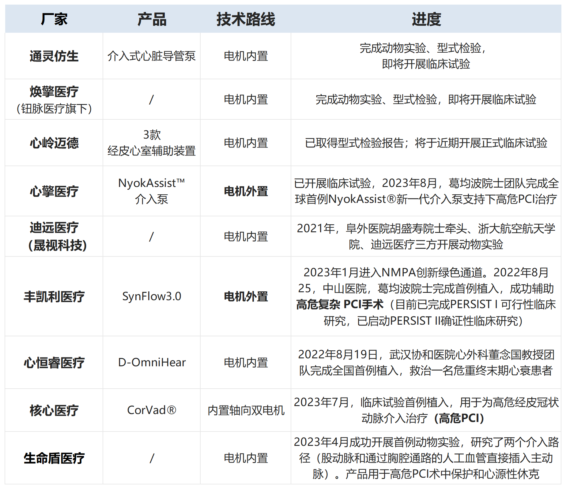 介入式人工心臟是高技術(shù)、高門檻賽道,國內(nèi)有少數(shù)創(chuàng)新企業(yè)布局。其中,心恒睿醫(yī)療、核心醫(yī)療、通靈仿生、心嶺邁德、晟視科技、心擎醫(yī)療、豐凱利醫(yī)療等企業(yè)不僅在資本寒冬期逆勢完成融資,且相關(guān)產(chǎn)品推進順利,進展極快。