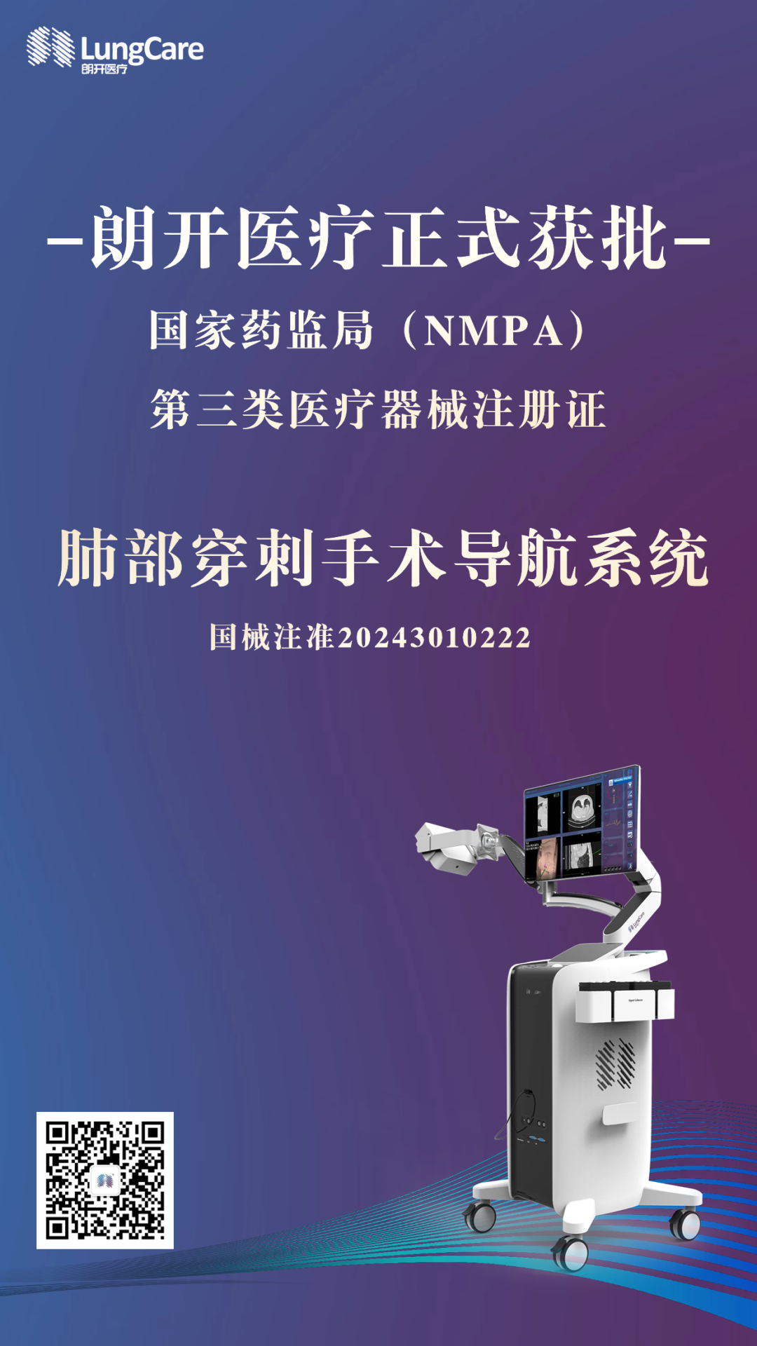 2024年1月31日,經(jīng)國家藥品監(jiān)督管理局公示,蘇州朗開醫(yī)療技術有限公司自主研發(fā)的肺部穿刺手術導航系統(tǒng)(國械注準20243010222)獲得NMPA批準上市,奧泰康助力本項目注冊申報服務,系2024年奧泰康助力獲得的首張三類醫(yī)療器械注冊證。
