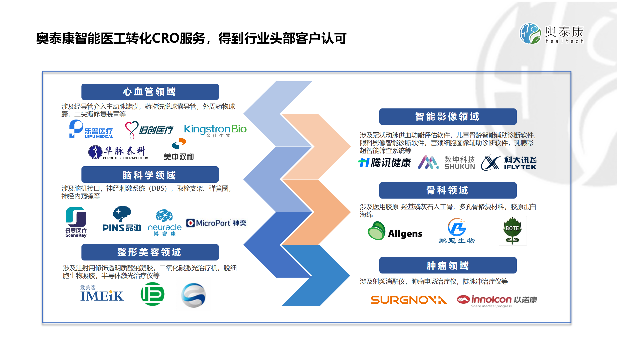 奧泰康始終以臨床需求為導(dǎo)向,依托CRO&CDMO一體化服務(wù),以服務(wù)技術(shù)創(chuàng)新為引領(lǐng),在以心腦血管、神經(jīng)介入、人工智能、醫(yī)美整形、骨科、腫瘤等為主的多個(gè)臨床應(yīng)用領(lǐng)域持續(xù)發(fā)軔,通過(guò)提供時(shí)效性強(qiáng)、成本可控、質(zhì)量有保障和專(zhuān)業(yè)性的全流程解決方案,持續(xù)推動(dòng)安全、有效和質(zhì)量可控的產(chǎn)品進(jìn)入市場(chǎng),推動(dòng)臨床科技成果轉(zhuǎn)化落地。
