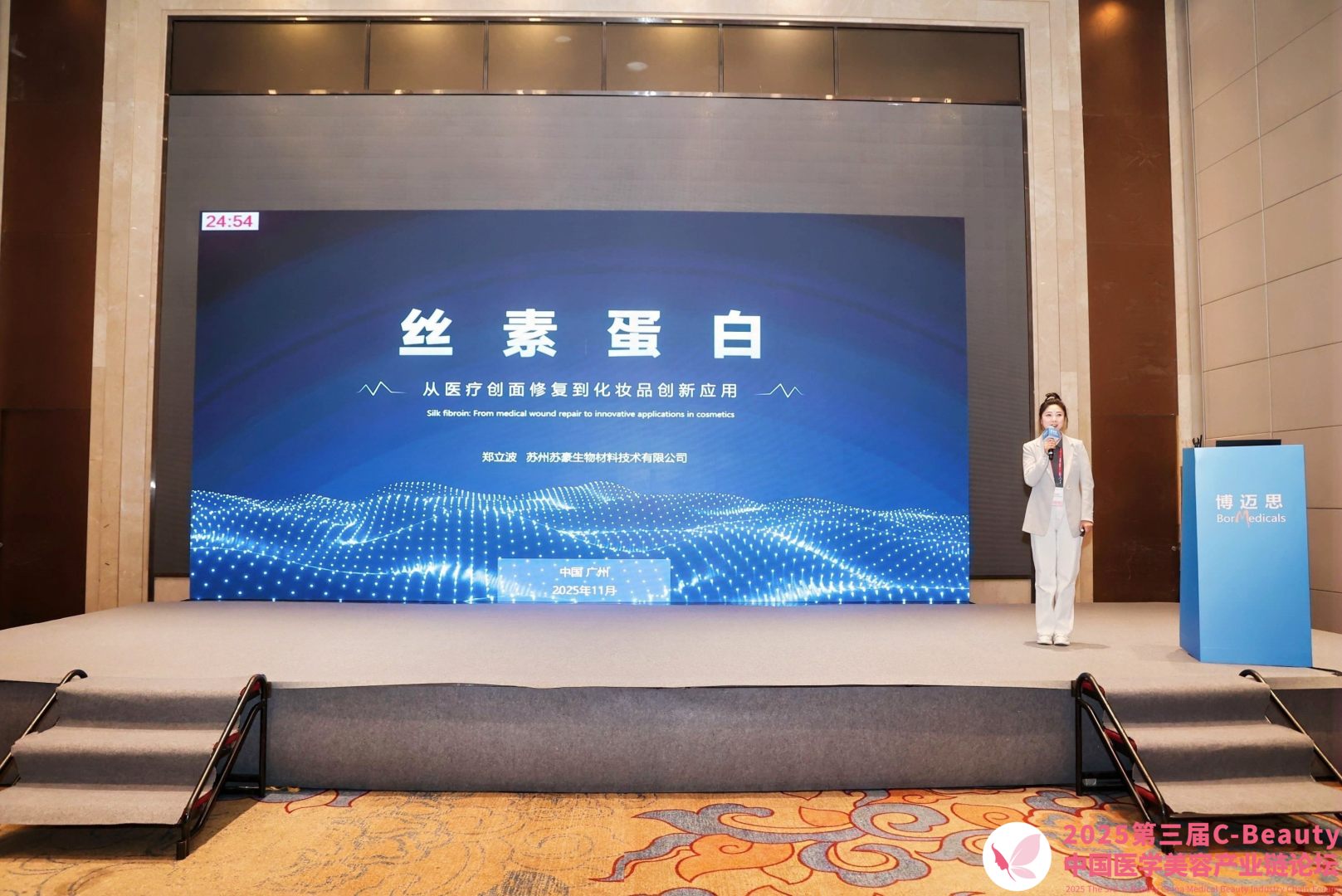 21日上午,蘇豪生物化妝品事業(yè)部總經(jīng)理鄭立波女士受邀出席“醫(yī)美智造與工藝創(chuàng)新”分論壇并作主題演講《絲素蛋白:從醫(yī)療創(chuàng)面修復到化妝品創(chuàng)新應用》。