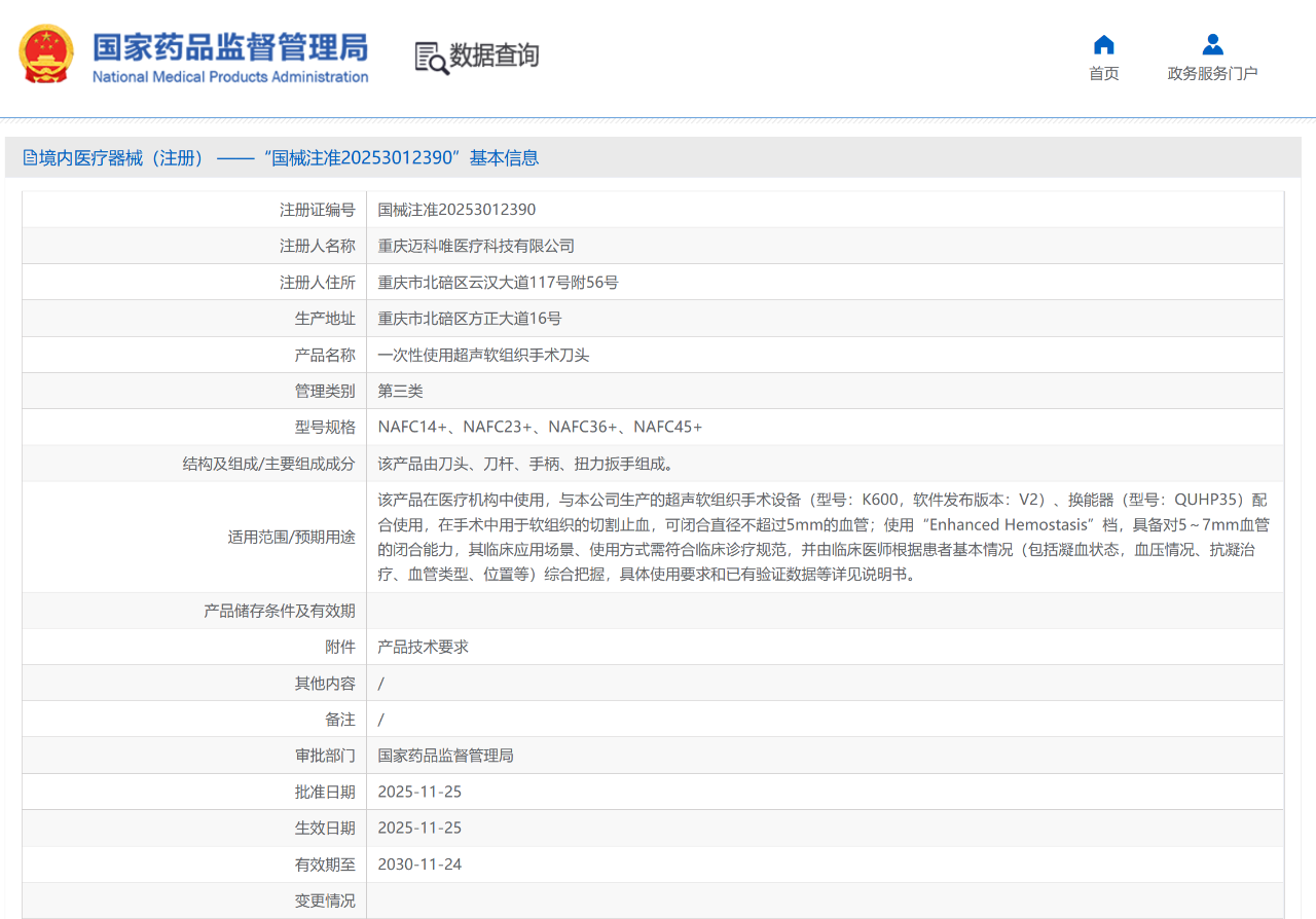 MA成果[慶祝]奧泰康助力邁科唯「一次性使用超聲軟組織手術(shù)刀頭」獲批上市[煙花]系本年度助力獲得的第14張三類注冊證??2025年11月,經(jīng)國家藥品監(jiān)督管理局公示,重慶邁科唯醫(yī)療科技有限公司研發(fā)的一次性使用超聲軟組織手術(shù)刀頭(國械注準20253012390)獲得NMPA批準上市,奧泰康提供市場準入MA解決方案。