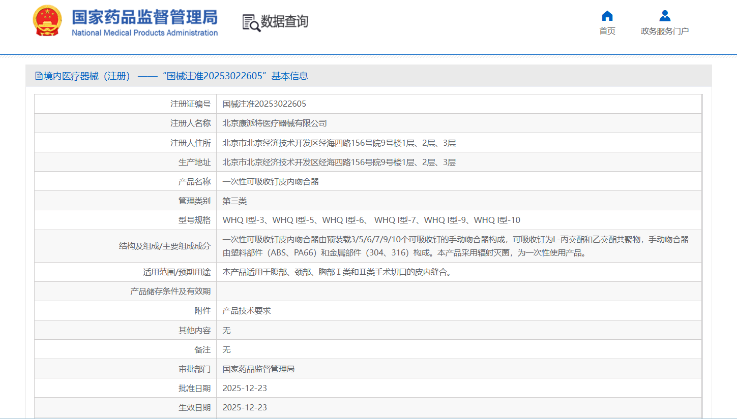 MA成果[慶祝] 奧泰康助力康派特醫(yī)療「一次性可吸收釘皮內(nèi)吻合器」獲批上市[煙花] ——系本年度助力獲得的第19張三類注冊證??近期,經(jīng)國家藥品監(jiān)督管理局公示,北京康派特醫(yī)療器械有限公司自主研發(fā)的產(chǎn)品一次性可吸收釘皮內(nèi)吻合器(國械注準(zhǔn)20253022605)獲得NMPA批準(zhǔn)上市,奧泰康提供MA解決方案。