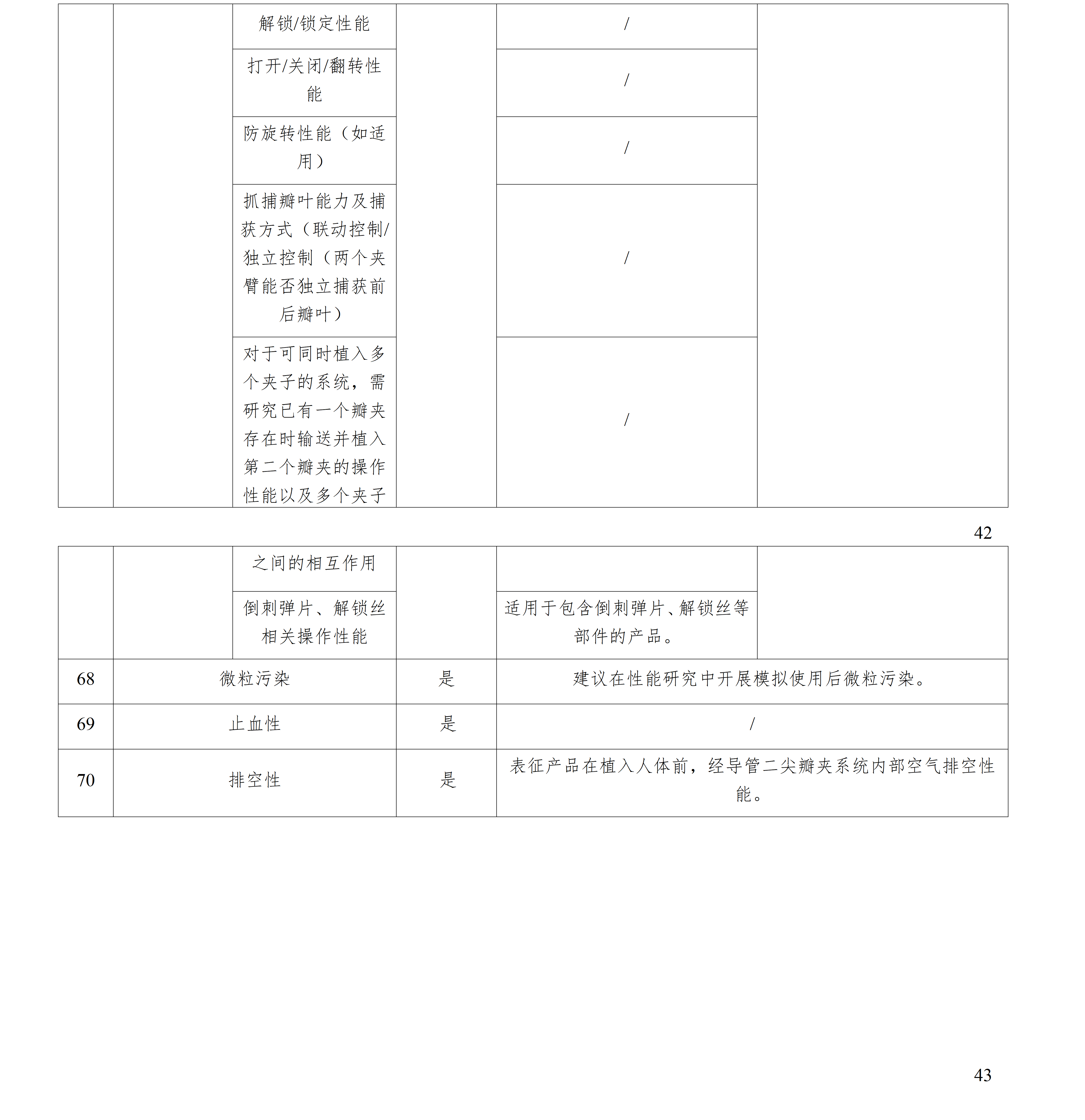 對(duì)于經(jīng)導(dǎo)管二尖瓣夾系統(tǒng),性能研究項(xiàng)目包括但不限于附表1所列項(xiàng)目。申請(qǐng)人應(yīng)根據(jù)具體產(chǎn)品特性,考慮應(yīng)增加的性能研究項(xiàng)目,對(duì)于附表1列舉的項(xiàng)目中,如不適用,亦應(yīng)提供合理性理由及依據(jù)。